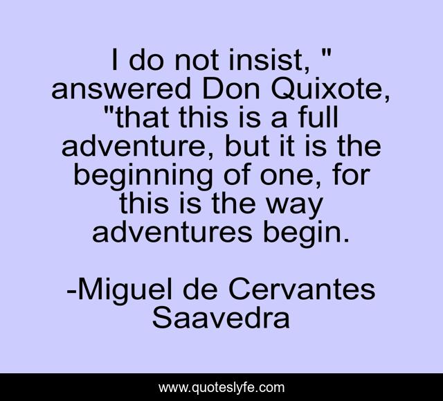 This page presents the quote "I do not insist, " answered Don Quixote, "that this is a full adventure, but it is the beginning of one, for this is the way adventures begin.". Author of this quote is Miguel de Cervantes Saavedra. .