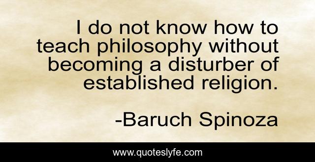 This page presents the quote "I do not know how to teach philosophy without becoming a disturber of established religion.". Author of this quote is Baruch Spinoza. This quote is about disturbance, philosophy, revolution, established-norms, new, teach,.