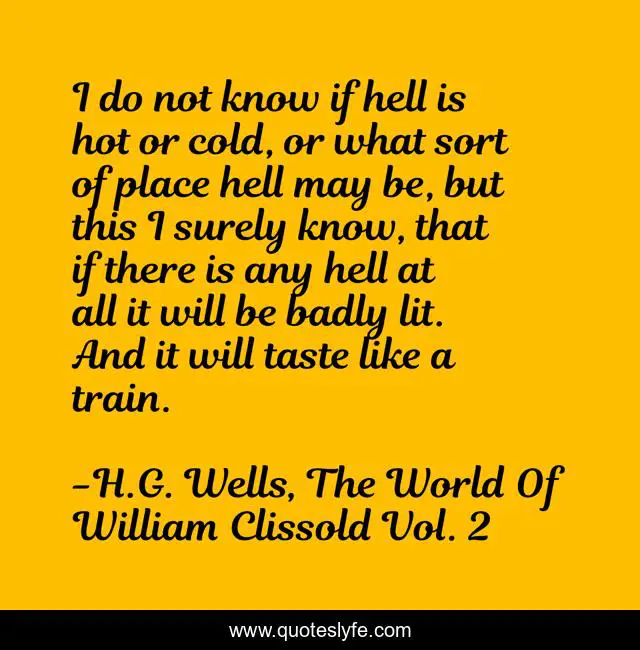 This page presents the quote "I do not know if hell is hot or cold, or what sort of place hell may be, but this I surely know, that if there is any hell at all it will be badly lit. And it will taste like a train.". Author of this quote is H.G. Wells, The World Of William Clissold Vol. 2. .
