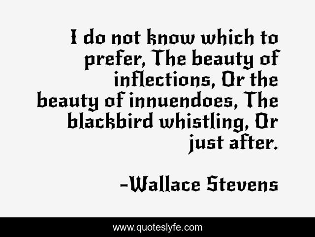 This page presents the quote "I do not know which to prefer, The beauty of inflections, Or the beauty of innuendoes, The blackbird whistling, Or just after.". Author of this quote is Wallace Stevens. This quote is about which, just,.
