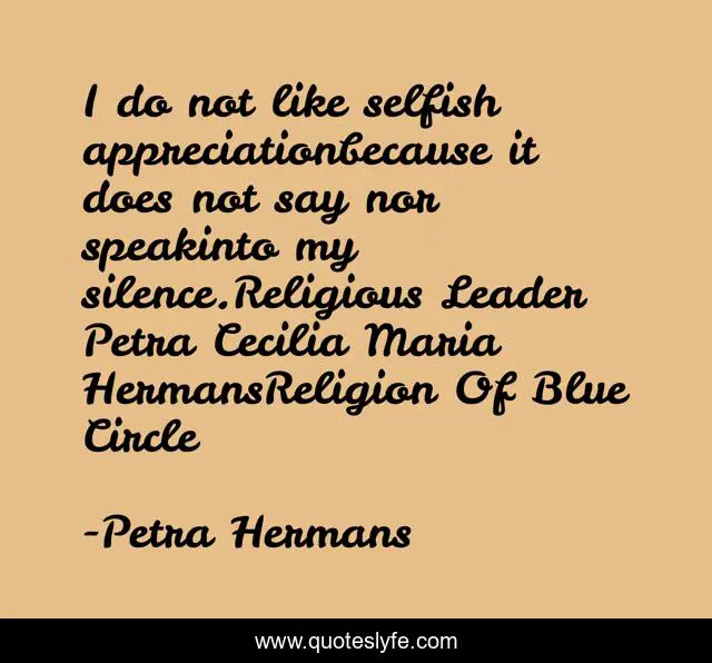 This page presents the quote "I do not like selfish appreciationbecause it does not say nor speakinto my silence.Religious Leader Petra Cecilia Maria HermansReligion Of Blue Circle". Author of this quote is Petra Hermans. .