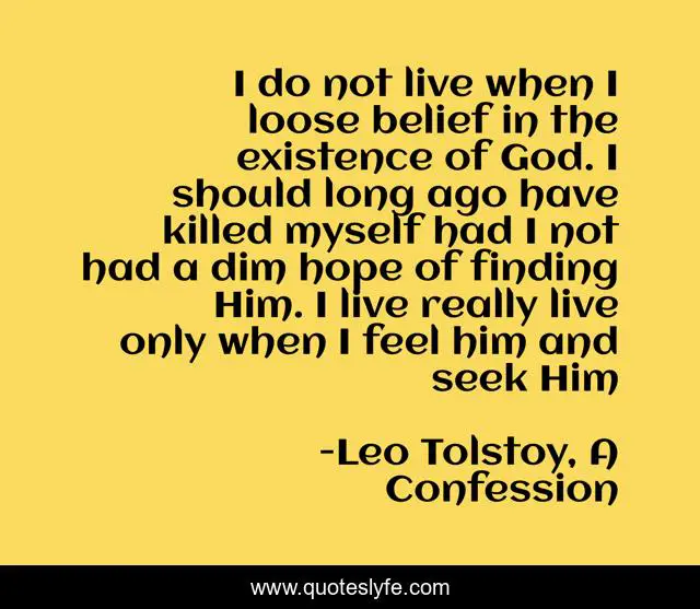 This page presents the quote "I do not live when I loose belief in the existence of God. I should long ago have killed myself had I not had a dim hope of finding Him. I live really live only when I feel him and seek Him". Author of this quote is Leo Tolstoy, A Confession. This quote is about god, meaning-of-life, suicide, belief,.