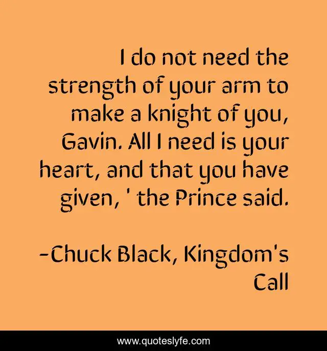 This page presents the quote "I do not need the strength of your arm to make a knight of you, Gavin. All I need is your heart, and that you have given, ' the Prince said.". Author of this quote is Chuck Black, Kingdom's Call. This quote is about heart, chuck-black, strength, kingdom-series,.