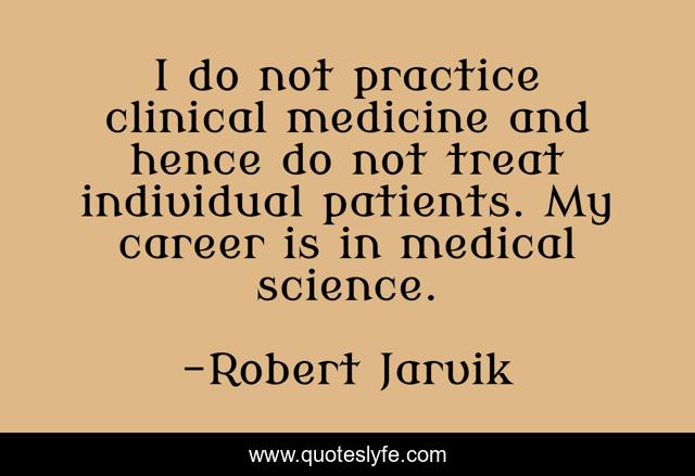 This page presents the quote "I do not practice clinical medicine and hence do not treat individual patients. My career is in medical science.". Author of this quote is Robert Jarvik. This quote is about science, practice, treat,.
