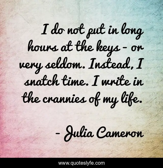 This page presents the quote "I do not put in long hours at the keys - or very seldom. Instead, I snatch time. I write in the crannies of my life.". Author of this quote is Julia Cameron. This quote is about finding-time, time, writing-process, writing,.