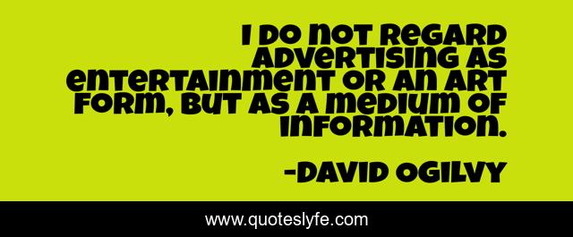 This page presents the quote "I do not regard advertising as entertainment or an art form, but as a medium of information.". Author of this quote is David Ogilvy. This quote is about information, advertising,.