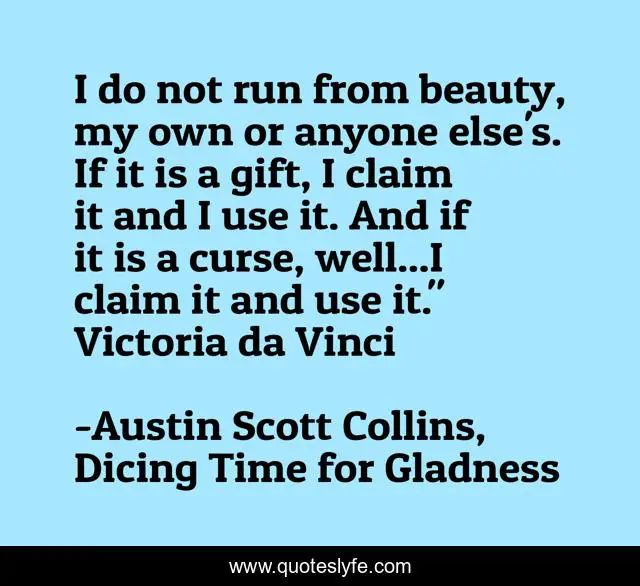 This page presents the quote "I do not run from beauty, my own or anyone else's. If it is a gift, I claim it and I use it. And if it is a curse, well...I claim it and use it." Victoria da Vinci". Author of this quote is Austin Scott Collins, Dicing Time for Gladness. This quote is about confidence, self-awareness, self-awareness-honesty-self, beauty,.
