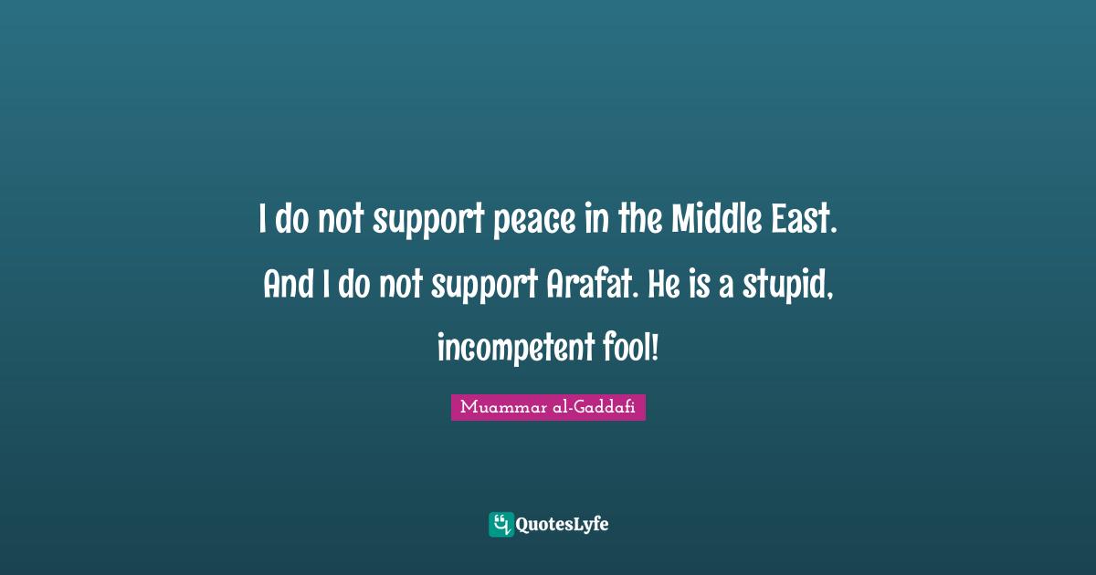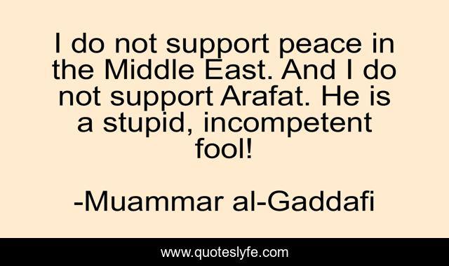 This page presents the quote "I do not support peace in the Middle East. And I do not support Arafat. He is a stupid, incompetent fool!". Author of this quote is Muammar al-Gaddafi. This quote is about fool, support, stupid,.