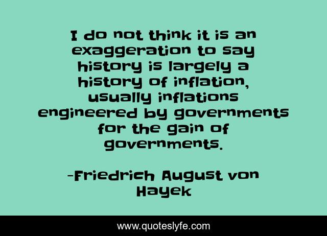 This page presents the quote "I do not think it is an exaggeration to say history is largely a history of inflation, usually inflations engineered by governments for the gain of governments.". Author of this quote is Friedrich August von Hayek. This quote is about think, gain,.