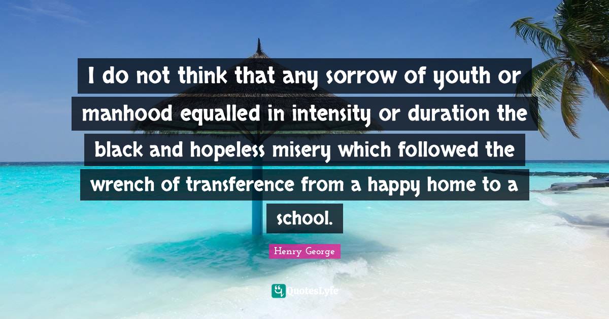 This page presents the quote "I do not think that any sorrow of youth or manhood equalled in intensity or duration the black and hopeless misery which followed the wrench of transference from a happy home to a school.". Author of this quote is Henry George. This quote is about intensity, sorrow, hopeless, black, misery, happy home, duration, school, youth,.