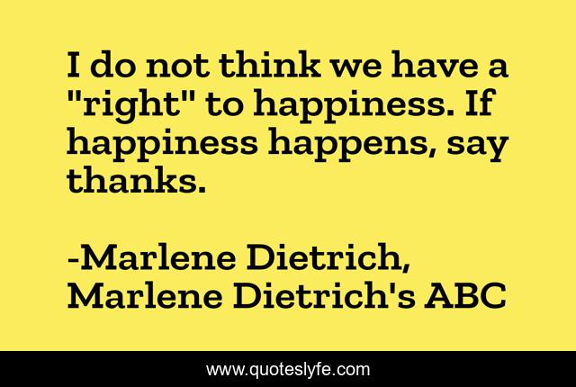 This page presents the quote "I do not think we have a "right" to happiness. If happiness happens, say thanks.". Author of this quote is Marlene Dietrich, Marlene Dietrich's ABC. .