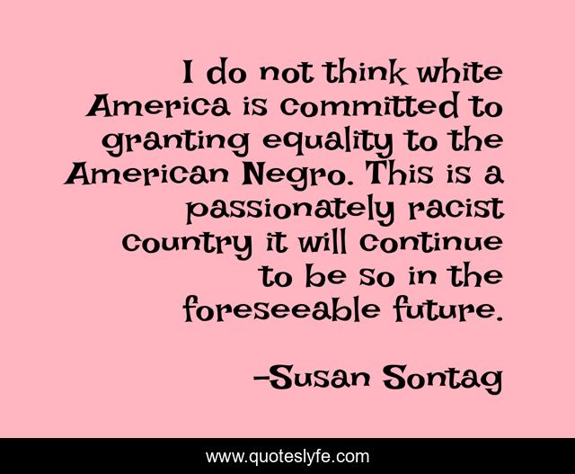 This page presents the quote "I do not think white America is committed to granting equality to the American Negro. This is a passionately racist country it will continue to be so in the foreseeable future.". Author of this quote is Susan Sontag. This quote is about american, future, america,.