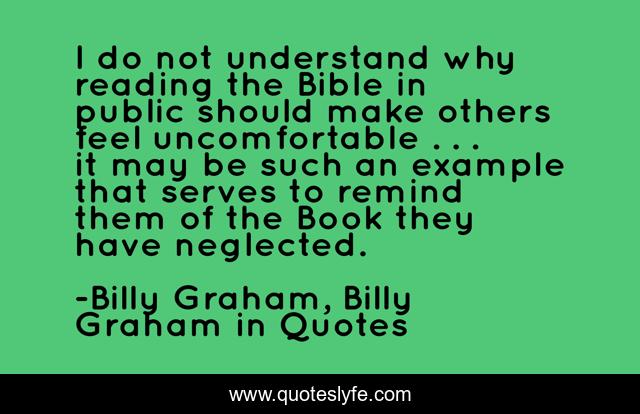 This page presents the quote "I do not understand why reading the Bible in public should make others feel uncomfortable . . . it may be such an example that serves to remind them of the Book they have neglected.". Author of this quote is Billy Graham, Billy Graham in Quotes. This quote is about bible, billy-graham,.