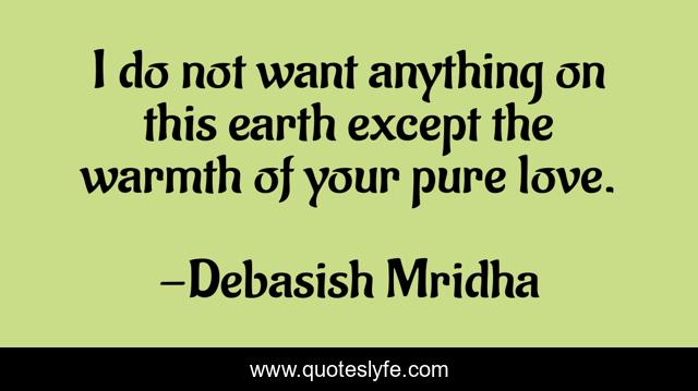 This page presents the quote "I do not want anything on this earth except the warmth of your pure love.". Author of this quote is Debasish Mridha. This quote is about love, inspirational, warmth-of-love, philosophy, debasish-mridha, quotes, pure-love, enthusiasm, debasish-mridha-m-d,.