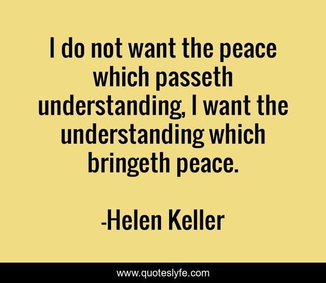 This page presents the quote "I do not want the peace which passeth understanding, I want the understanding which bringeth peace.". Author of this quote is Helen Keller. This quote is about education, ispirational, learning, understanding,.
