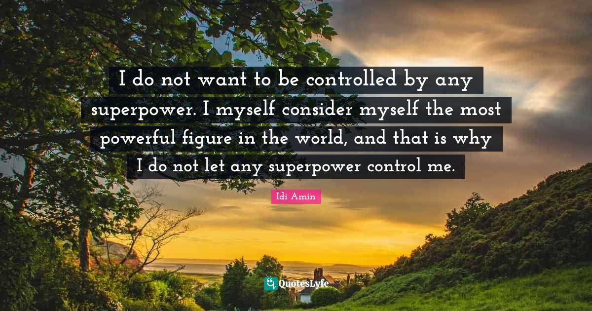This page presents the quote "I do not want to be controlled by any superpower. I myself consider myself the most powerful figure in the world, and that is why I do not let any superpower control me.". Author of this quote is Idi Amin. This quote is about controlled, superpower, uganda, most powerful, powerful, world,.