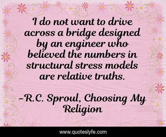 This page presents the quote "I do not want to drive across a bridge designed by an engineer who believed the numbers in structural stress models are relative truths.". Author of this quote is R.C. Sproul, Choosing My Religion. This quote is about gospel, relativism, truth,.