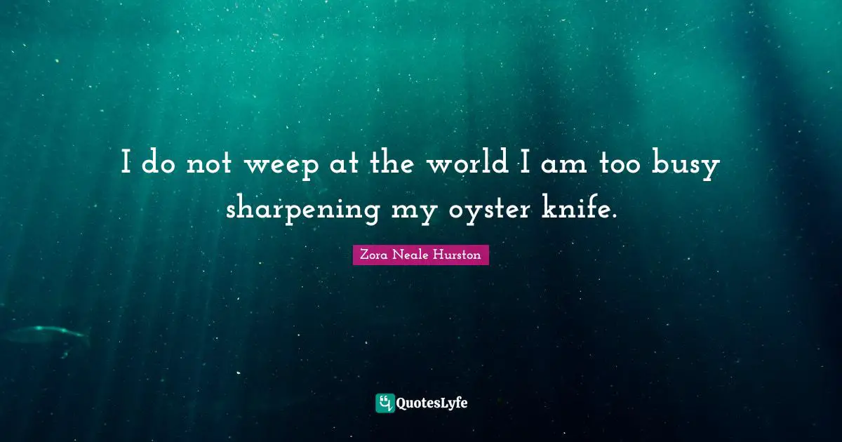 This page presents the quote "I do not weep at the world I am too busy sharpening my oyster knife.". Author of this quote is Zora Neale Hurston. This quote is about oysters, black history, world, knives, sharpening, too busy,.