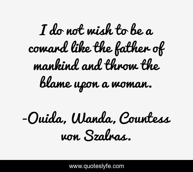 This page presents the quote "I do not wish to be a coward like the father of mankind and throw the blame upon a woman.". Author of this quote is Ouida, Wanda, Countess von Szalras.. This quote is about adam-and-eve, cowardice, men, women,.