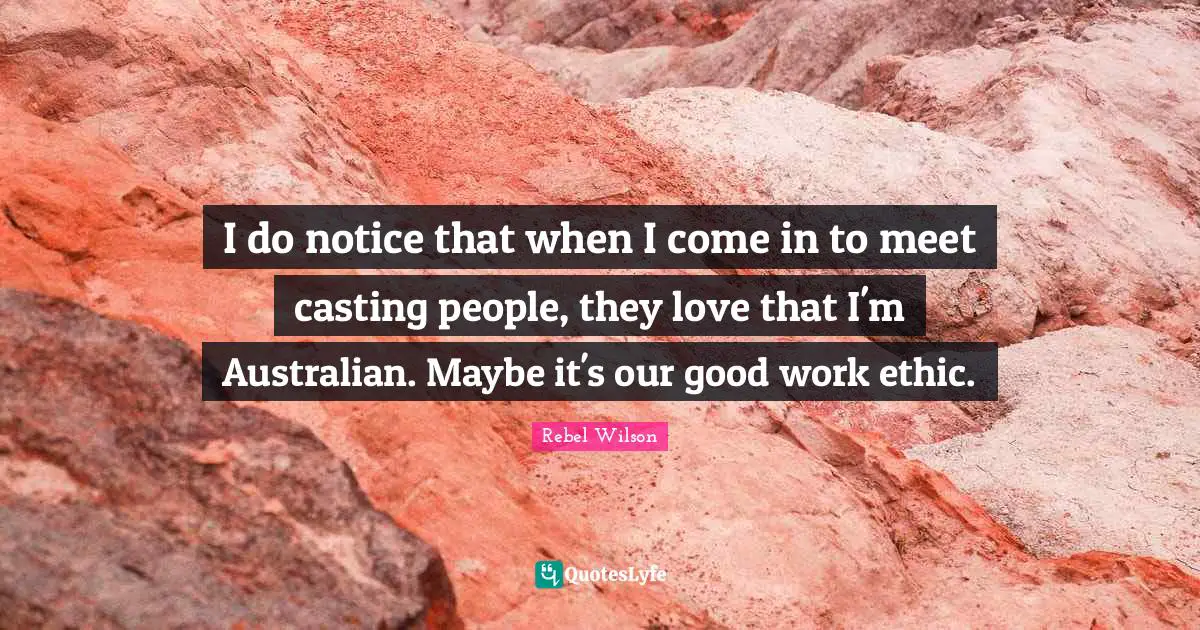 This page presents the quote "I do notice that when I come in to meet casting people, they love that I'm Australian. Maybe it's our good work ethic.". Author of this quote is Rebel Wilson. This quote is about love, work ethic, people, australian, casting, good work,.