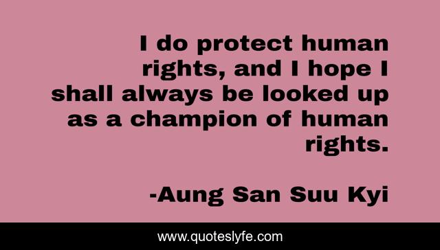 This page presents the quote "I do protect human rights, and I hope I shall always be looked up as a champion of human rights.". Author of this quote is Aung San Suu Kyi. This quote is about champion, human, rights,.