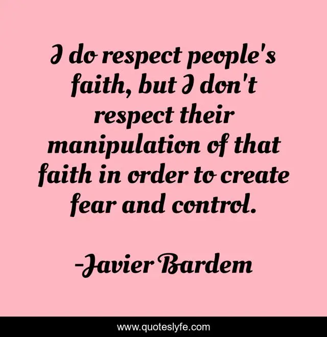 This page presents the quote "I do respect people's faith, but I don't respect their manipulation of that faith in order to create fear and control.". Author of this quote is Javier Bardem. This quote is about control, faith, fear,.