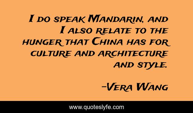 This page presents the quote "I do speak Mandarin, and I also relate to the hunger that China has for culture and architecture and style.". Author of this quote is Vera Wang. This quote is about culture, style, speak,.