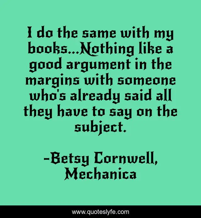 This page presents the quote "I do the same with my books...Nothing like a good argument in the margins with someone who's already said all they have to say on the subject.". Author of this quote is Betsy Cornwell, Mechanica. This quote is about fantasy, cinderella, fairy-tale, steampunk,.