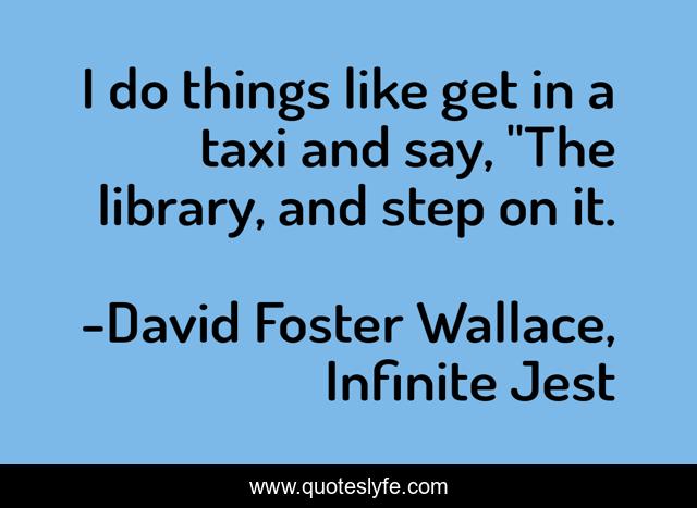This page presents the quote "I do things like get in a taxi and say, "The library, and step on it.". Author of this quote is David Foster Wallace, Infinite Jest. This quote is about books, infinite-jest,.