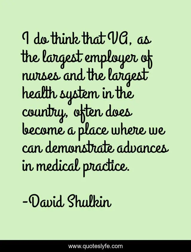 This page presents the quote "I do think that VA, as the largest employer of nurses and the largest health system in the country, often does become a place where we can demonstrate advances in medical practice.". Author of this quote is David Shulkin. This quote is about practice, health, think,.