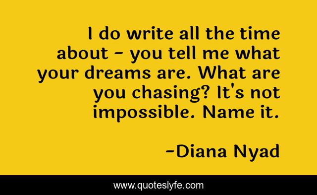 This page presents the quote "I do write all the time about - you tell me what your dreams are. What are you chasing? It's not impossible. Name it.". Author of this quote is Diana Nyad. This quote is about your dreams, me, time,.
