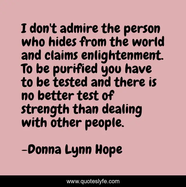 This page presents the quote "I don't admire the person who hides from the world and claims enlightenment. To be purified you have to be tested and there is no better test of strength than dealing with other people.". Author of this quote is Donna Lynn Hope. This quote is about tested, strength, people,.