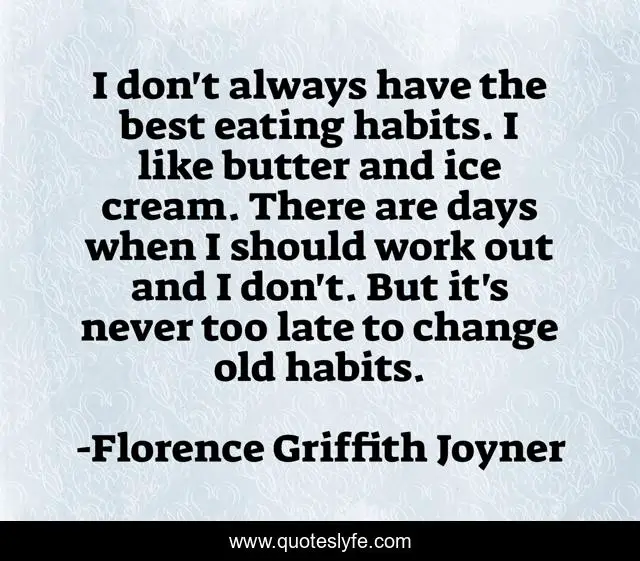 This page presents the quote "I don't always have the best eating habits. I like butter and ice cream. There are days when I should work out and I don't. But it's never too late to change old habits.". Author of this quote is Florence Griffith Joyner. This quote is about work, change, ice cream,.