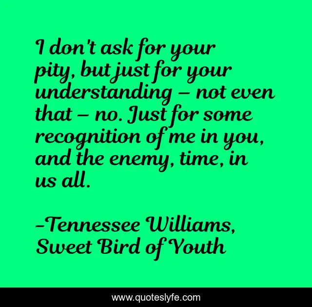 This page presents the quote "I don't ask for your pity, but just for your understanding – not even that – no. Just for some recognition of me in you, and the enemy, time, in us all.". Author of this quote is Tennessee Williams, Sweet Bird of Youth. This quote is about pity, aging, enemy, age, understanding, youth, time, recognition,.