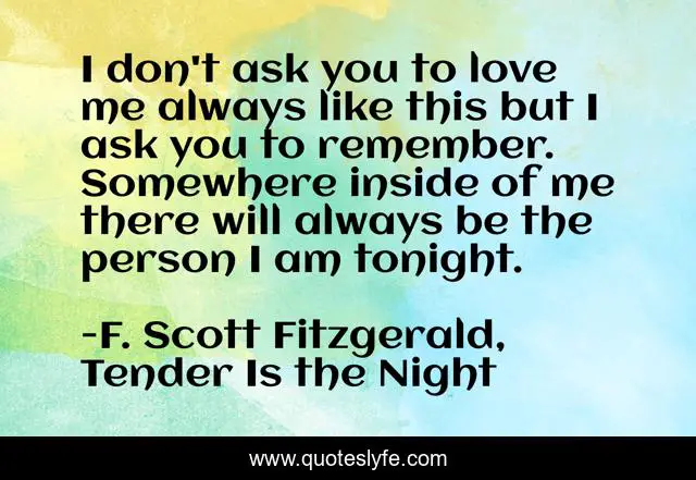 This page presents the quote "I don't ask you to love me always like this but I ask you to remember. Somewhere inside of me there will always be the person I am tonight.". Author of this quote is F. Scott Fitzgerald, Tender Is the Night. This quote is about love, remember, always, inside, tonight, affection,.
