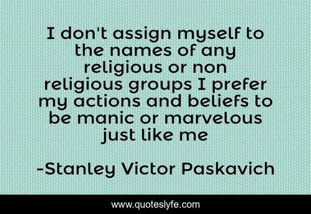 This page presents the quote "I don't assign myself to the names of any religious or non religious groups I prefer my actions and beliefs to be manic or marvelous just like me". Author of this quote is Stanley Victor Paskavich. This quote is about life, belief, spirituality, bi-polar, stantasyland, reality, religion, church, atheists,.