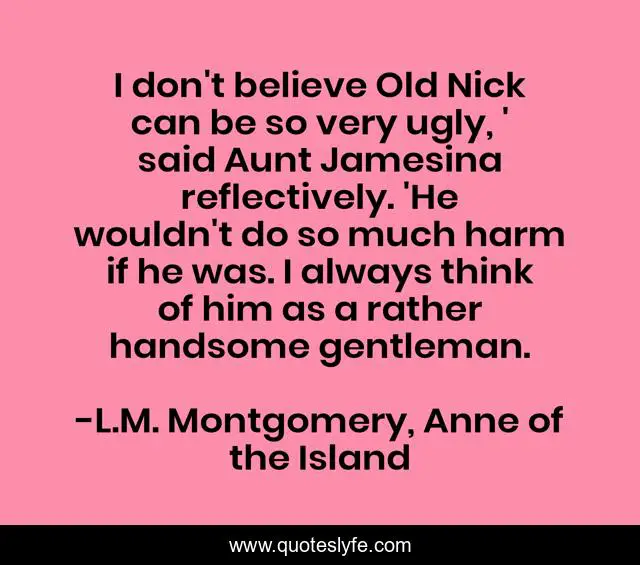 This page presents the quote "I don't believe Old Nick can be so very ugly, ' said Aunt Jamesina reflectively. 'He wouldn't do so much harm if he was. I always think of him as a rather handsome gentleman.". Author of this quote is L.M. Montgomery, Anne of the Island. This quote is about l-m-montgomery, satan,.