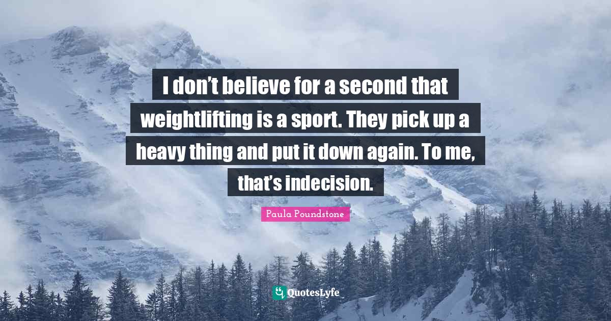 This page presents the quote "I don’t believe for a second that weightlifting is a sport. They pick up a heavy thing and put it down again. To me, that’s indecision.". Author of this quote is Paula Poundstone. This quote is about believe, heavy things, heavy, sports, weightlifting, indecision,.
