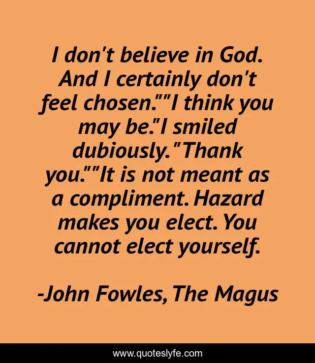 This page presents the quote "I don't believe in God. And I certainly don't feel chosen.""I think you may be."I smiled dubiously. "Thank you.""It is not meant as a compliment. Hazard makes you elect. You cannot elect yourself.". Author of this quote is John Fowles, The Magus. .