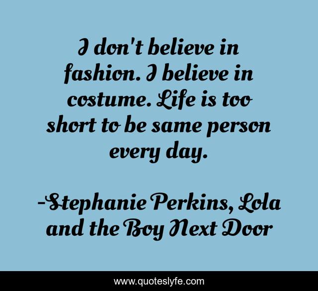 This page presents the quote "I don't believe in fashion. I believe in costume. Life is too short to be same person every day.". Author of this quote is Stephanie Perkins, Lola and the Boy Next Door. This quote is about individuality, fashion, self-expression,.