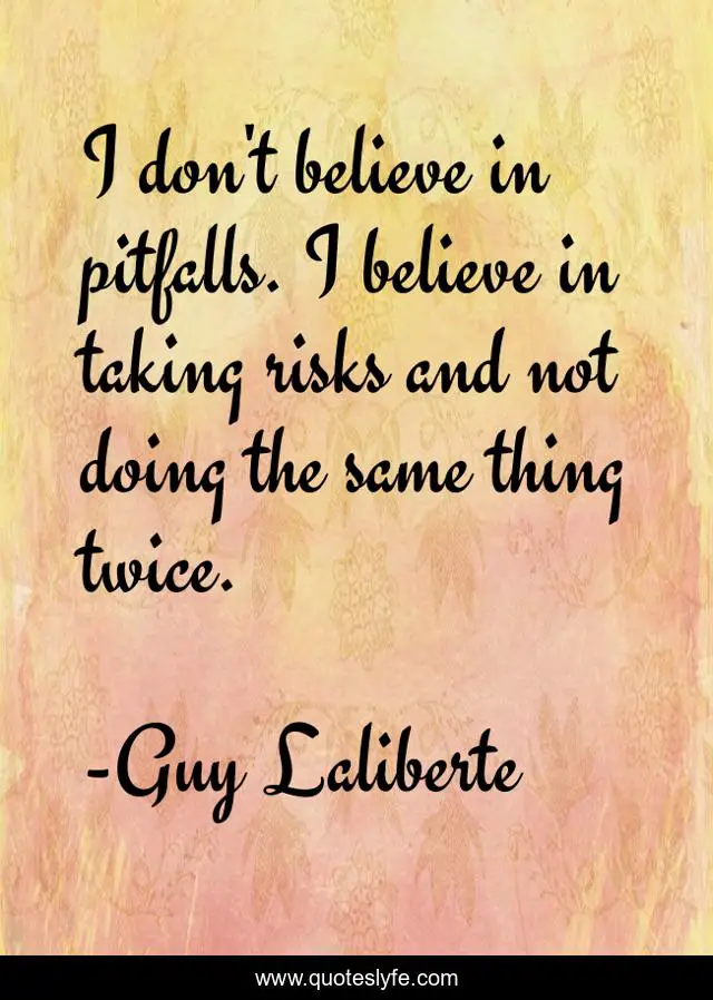 This page presents the quote "I don't believe in pitfalls. I believe in taking risks and not doing the same thing twice.". Author of this quote is Guy Laliberte. This quote is about i believe, believe, risks,.
