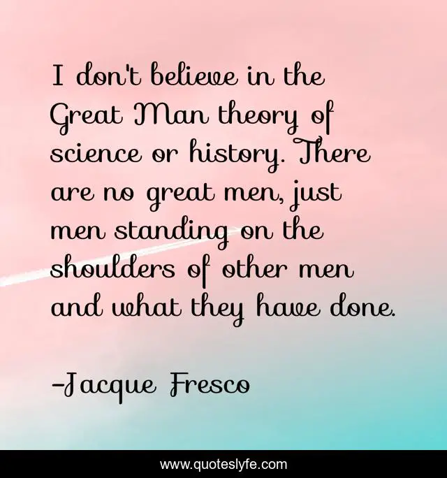 This page presents the quote "I don't believe in the Great Man theory of science or history. There are no great men, just men standing on the shoulders of other men and what they have done.". Author of this quote is Jacque Fresco. This quote is about great, history, man,.
