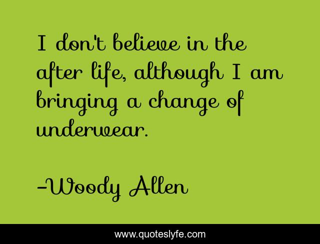 This page presents the quote "I don't believe in the after life, although I am bringing a change of underwear.". Author of this quote is Woody Allen. This quote is about life, change,.