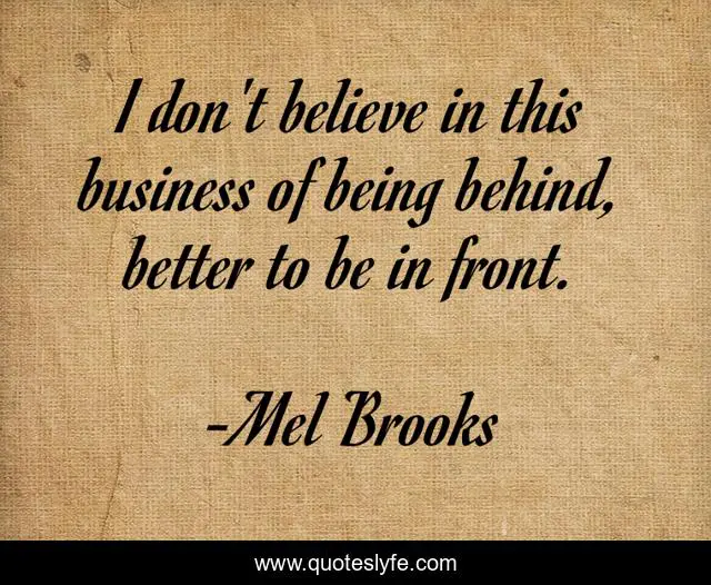This page presents the quote "I don't believe in this business of being behind, better to be in front.". Author of this quote is Mel Brooks. This quote is about better, behind, believe,.