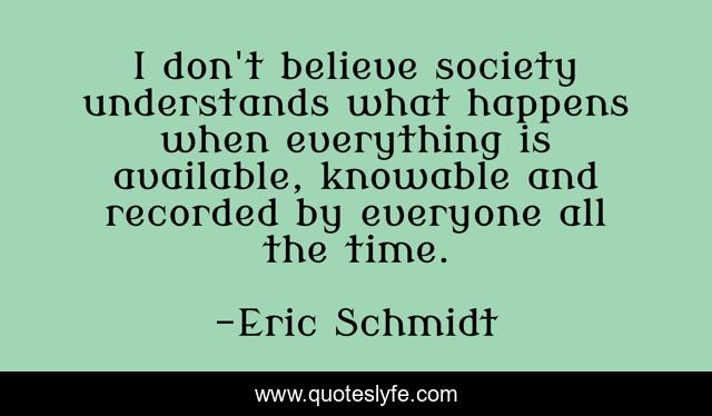 This page presents the quote "I don't believe society understands what happens when everything is available, knowable and recorded by everyone all the time.". Author of this quote is Eric Schmidt. This quote is about believe, everyone, time,.