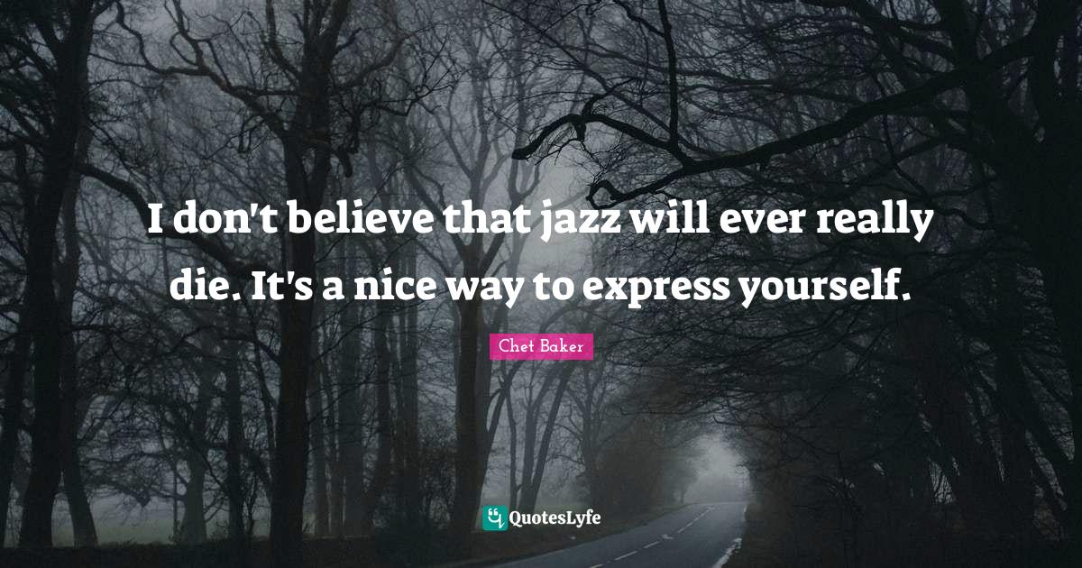 This page presents the quote "I don't believe that jazz will ever really die. It's a nice way to express yourself.". Author of this quote is Chet Baker. This quote is about express yourself, way, nice, don't believe, jazz, believe,.