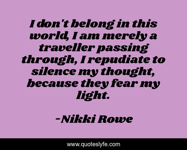 This page presents the quote "I don't belong in this world, I am merely a traveller passing through, I repudiate to silence my thought, because they fear my light.". Author of this quote is Nikki Rowe. This quote is about wise-words, love, truth, light, traveller, wisdom, journey, lightworkers, unconditional-love,.