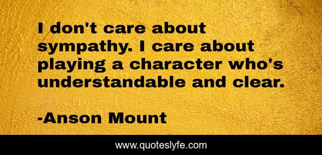 This page presents the quote "I don't care about sympathy. I care about playing a character who's understandable and clear.". Author of this quote is Anson Mount. This quote is about character, i care, care,.