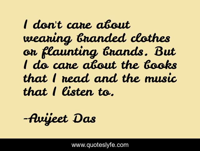 This page presents the quote "I don't care about wearing branded clothes or flaunting brands. But I do care about the books that I read and the music that I listen to.". Author of this quote is Avijeet Das. This quote is about no-slave-to-brands, life, meaning-of-life, good-habits, writer, writers-books, books, music, bookbook-lovers,.