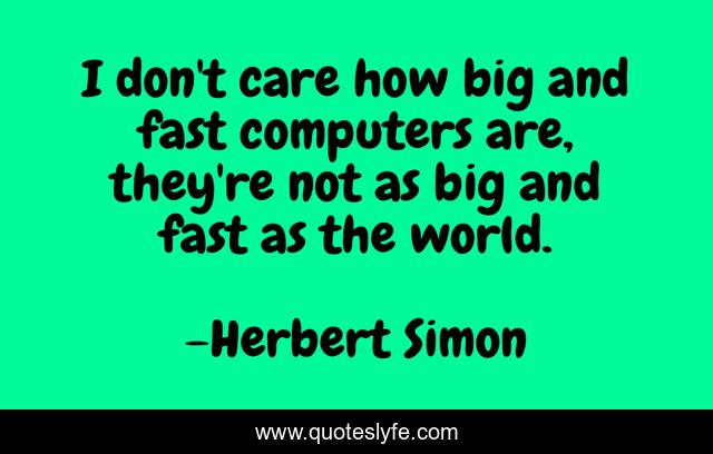 This page presents the quote "I don't care how big and fast computers are, they're not as big and fast as the world.". Author of this quote is Herbert Simon. This quote is about world, fast, care,.